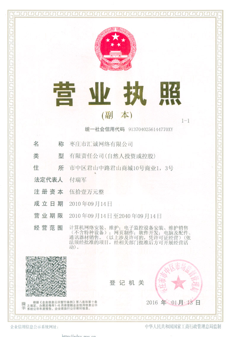 特提供三證合一后的新營業(yè)執(zhí)照副本如下 棗莊市匯誠網(wǎng)絡(luò)有限公司營業(yè)執(zhí)照(統(tǒng)一社會(huì)信用代碼:9137040256144770XY)